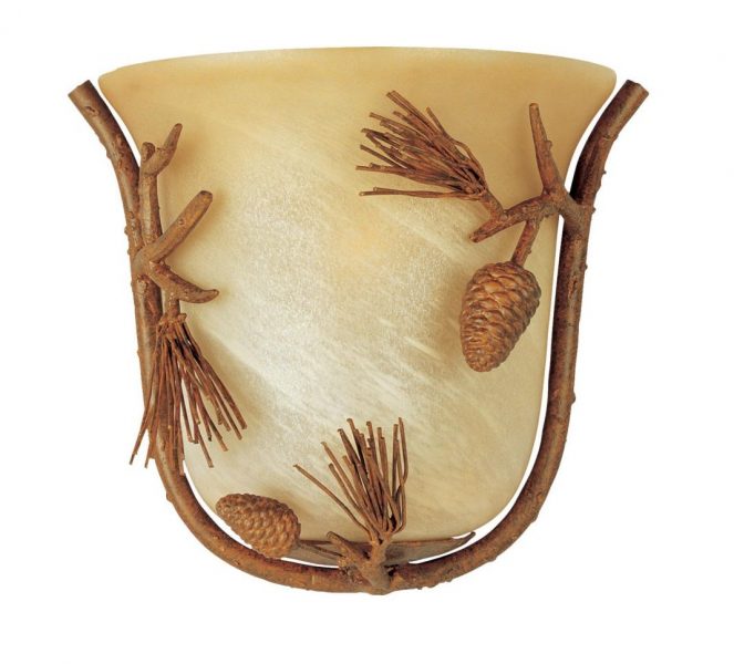 This Pinecone Wall Sconce has natural rust colors and hand forged steel. The details make this an attractive light for any rustic style bathroom or hallway. The intricate forged steel and pinecones are very realistic. They come in a rusty red color.