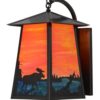 This nature inspired sconce depicts a Deer scampering among the enchanting forest against an Emerald Green Waterglass background, with a morning sky featured in Beige Iridescent art glass. The solid steel lantern is enhanced with decorative accents and a frame featured in an Tarnished Copper finish. The fixture is handcrafted in the USA by highly skilled Meyda artisans. Current lead time 60 days.